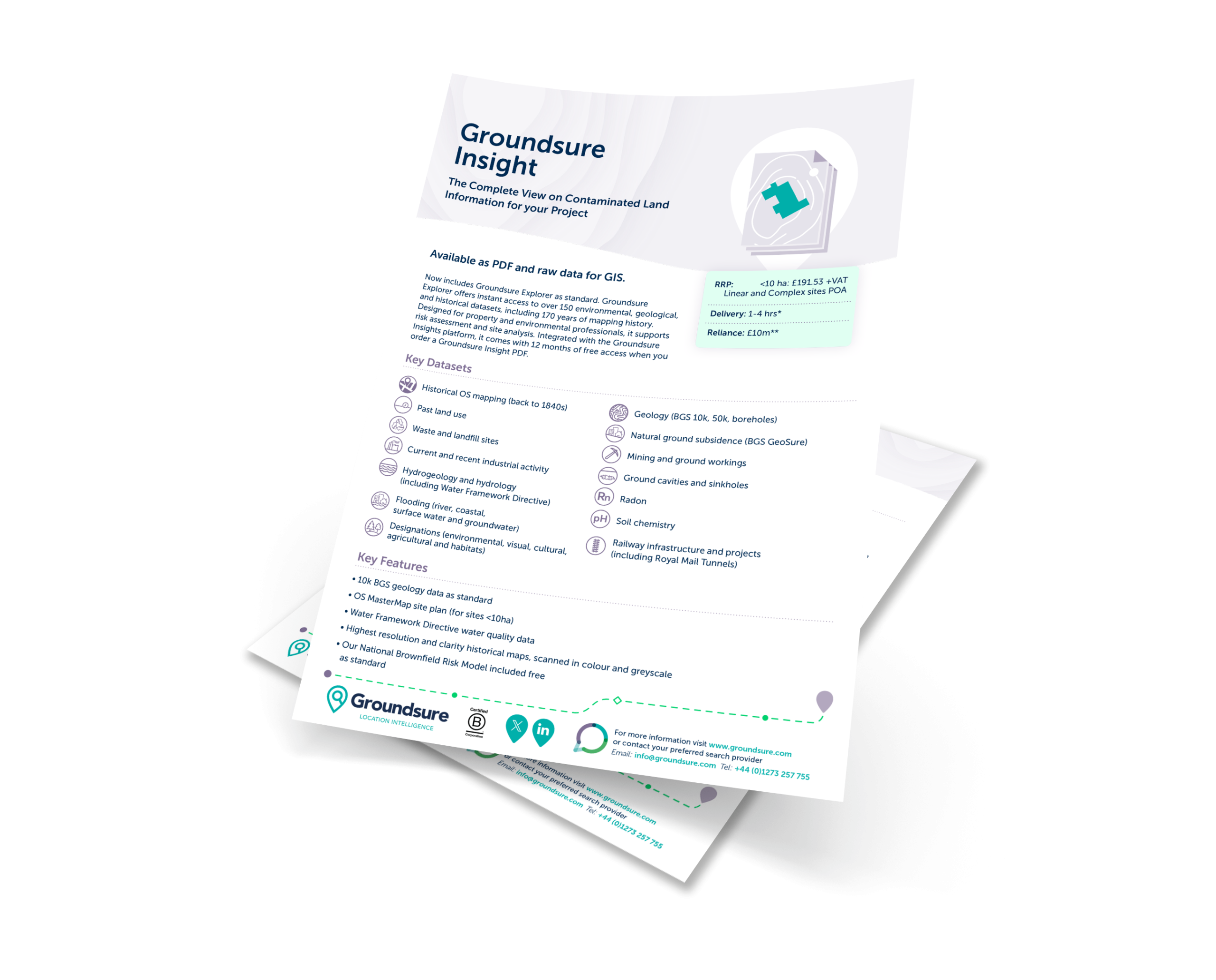 The complete view on contaminated land information for your project now includes Groundsure Explorer as standard. Groundsure Explorer offers instant access to over 150 environmental, geological, and historical datasets, including 170 years of mapping history. Designed for property and environmental professionals, it supports risk assessment and site analysis. Integrated with the Groundsure Insights platform, it comes with 12 months of free access when you order a Groundsure Insight PDF.